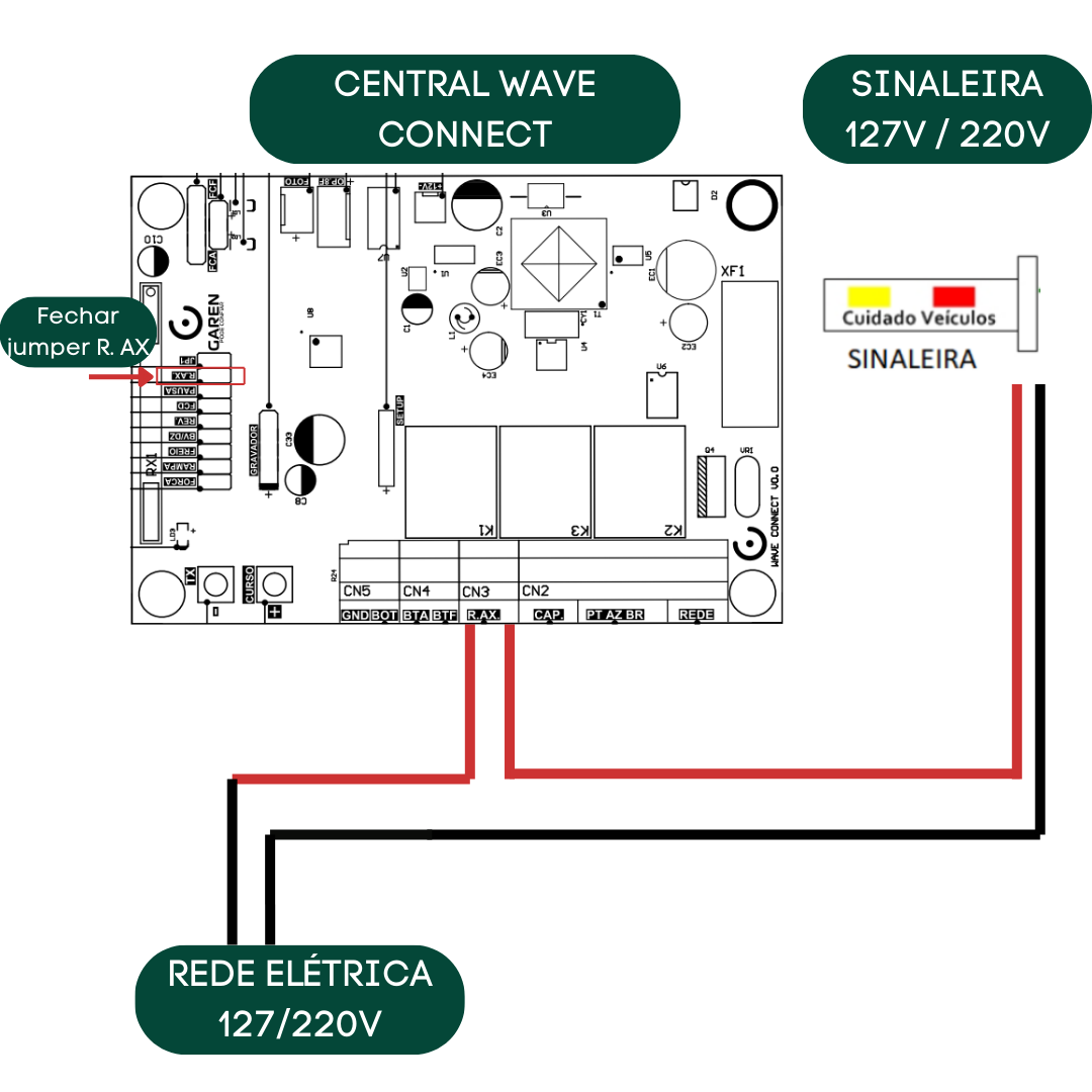 Para a utilização de sinaleira para portão, a central Wave possui um rele auxiliar para a ligação de dispositivos como trava, sinaleira ou luz de garagem.